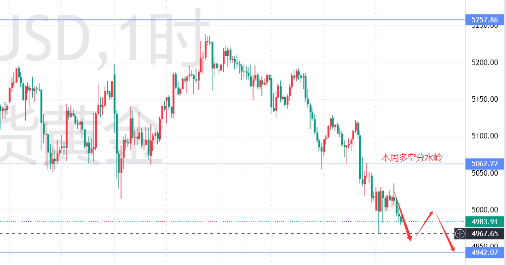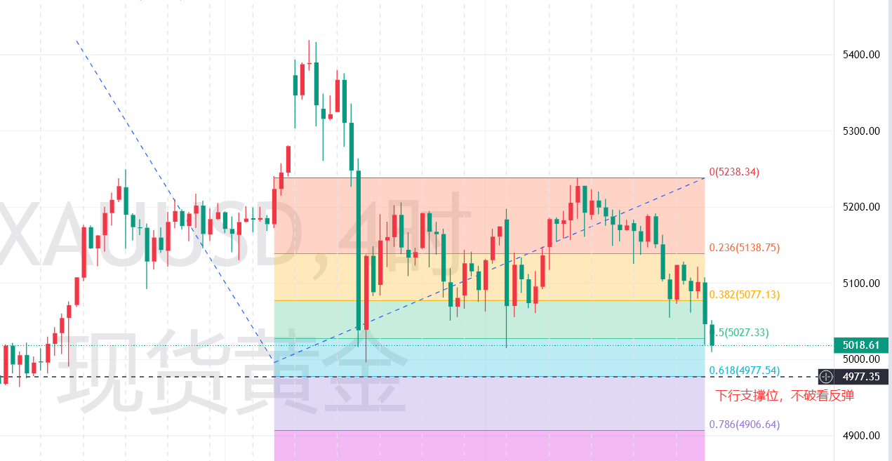 当下黄金下跌,主要源于市场情绪与政策预期波动。市场对美联储降息预期降温,资金持币观望 ,等待明确信号 。一旦降息预期重燃,资金将回流黄金,通胀逻辑将推动金价上扬。金价跌破5000后 ,下行空间已然打开,早盘的探底回升构筑起企稳信号。今日,5000 - 5010区域的压力位至关重要 。若金价能站稳5100上方 ,下跌动能将大幅削弱,行情重回箱体震荡,多空陷入拉锯;若强势突破该压力区 ,上行目标直指5300。反之,若价格在此区域持续承压、震荡下行,空头压力将再度升级 ,下方有望测试4942位置。
